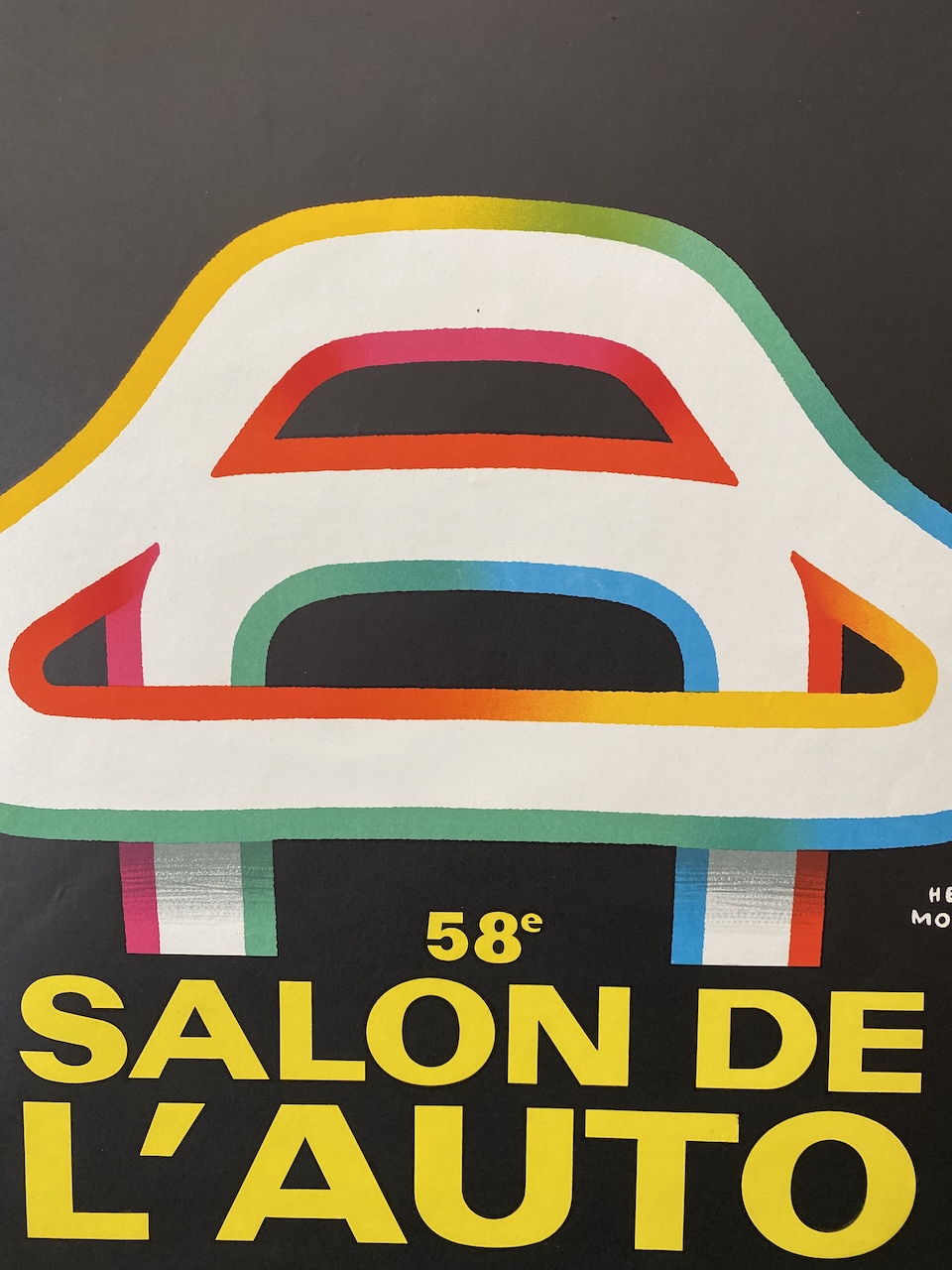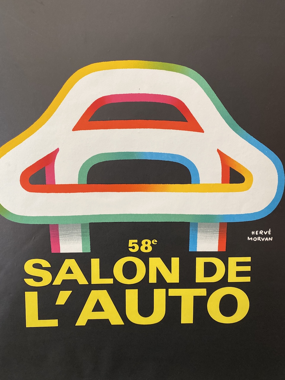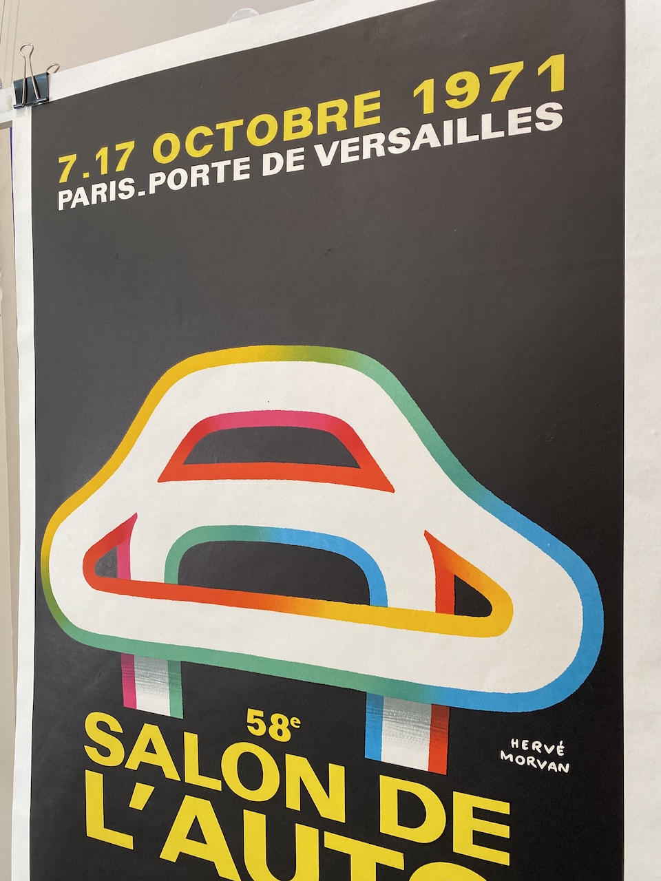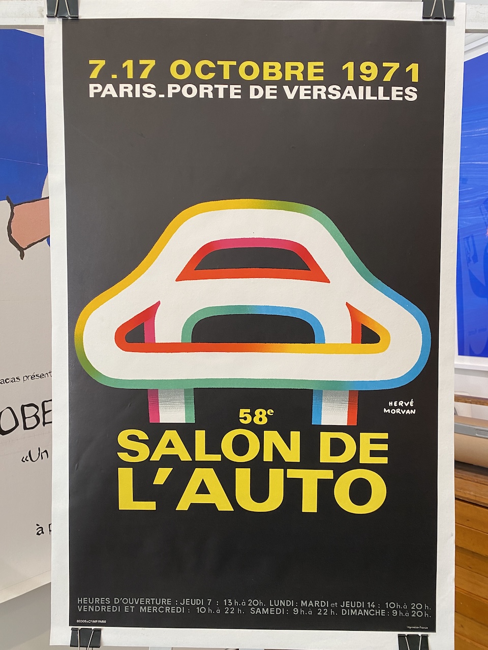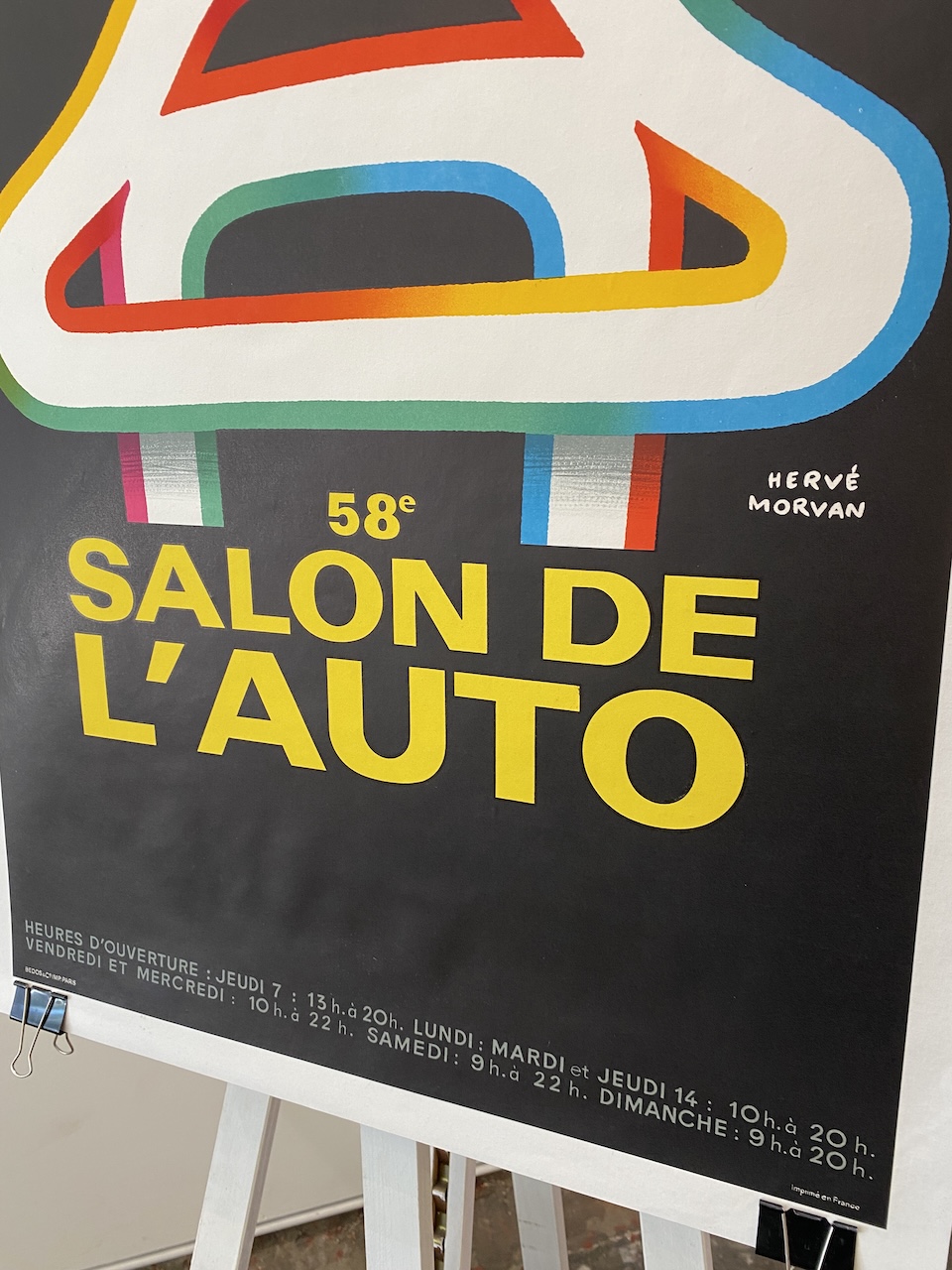 This is an original vintage poster for an auto car show in 1971 in France by Herve Morvan. This poster is perfect for any car enthusiast! It has been linen backed for preservation and is in excellent condition. A fun and colourful medium format poster!